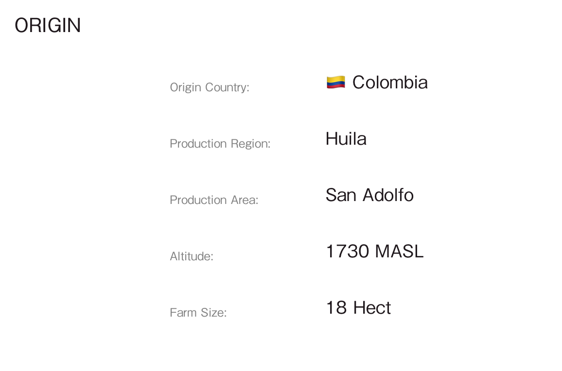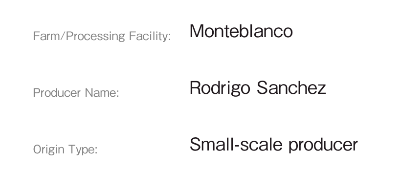 Monteblanco is a 14-hectare family-run farm located in the San Adolfo region of Huila, Colombia, managed by Rodrigo Sánchez Valencia alongside his wife Claudia Samboni, his daughter Nathalia and farm manager Don Gerardo. The farm is situated beside the Cueva de los Guácharos National Natural Park and the Suaza River Valley, benefiting from the area's rich biodiversity and favorable environmental conditions for coffee cultivation. Monteblanco is known for its commitment to producing high-quality coffees, including varieties such as Geisha, Pink Bourbon, Pacamara, and Purple Caturra. Monteblanco is one of six farms owned by Rodrigo which he united under one company Aromas Del Sur in 2017, including their own dry mill in Pitalito.
